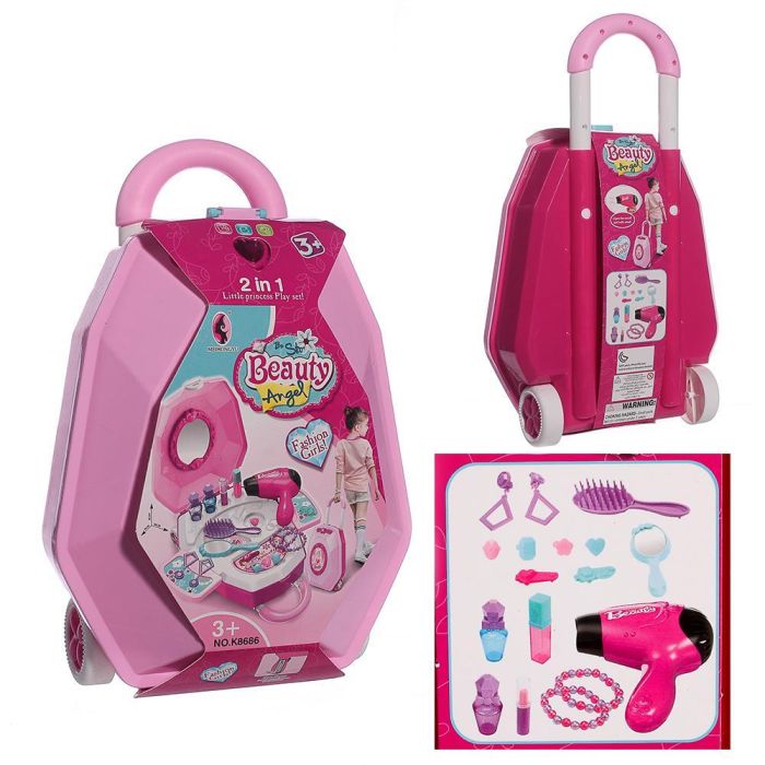 У комплект входять фен, гребінець, зеркало, флакони, помада, сережки, шпильки, складаються у валізу, на батарейці.